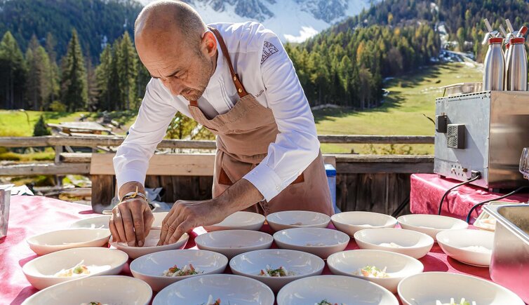 Das Tagesevent an der Bergstation präsentiert Gerichte, die von den Gastköchen zu bestimmten Themen mit jeweils einem Produkt eines heimischen Produzenten / Produzentin oder Bauern / Bäuerin kreiert werden, und von Besucher*innen nach freier Wahl verkostet werden können.