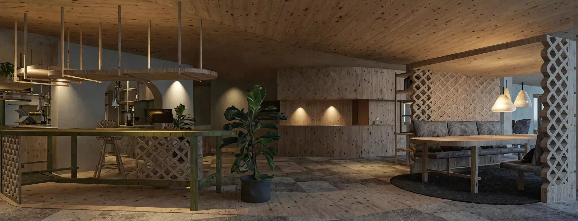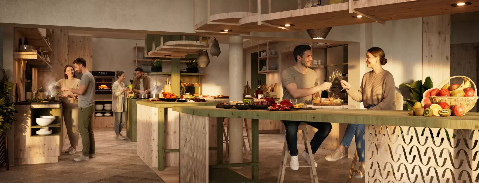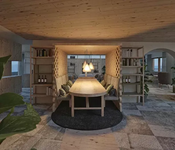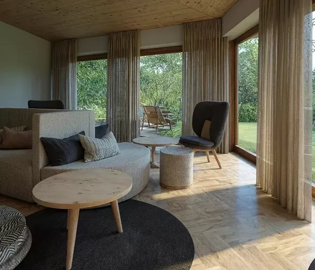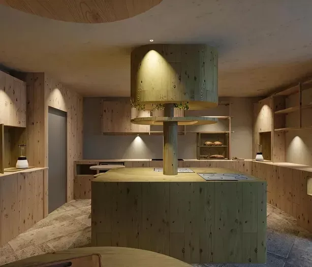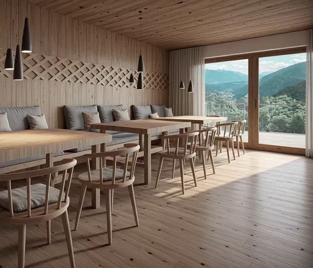 Die Einrichtung des gesamten Hauses ist im alpinen Stil geplant – einladend und mit natürlichen Materialien gestaltet.