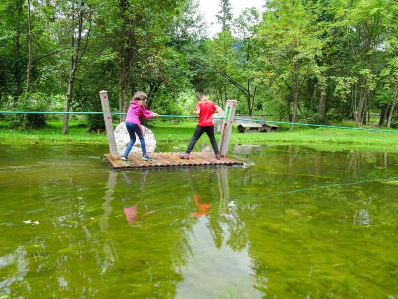 Water plays a central role and visitors can explore the natural pond on a raft. Several slides, swings and porch swings, as well as climbing installations ensure great fun!