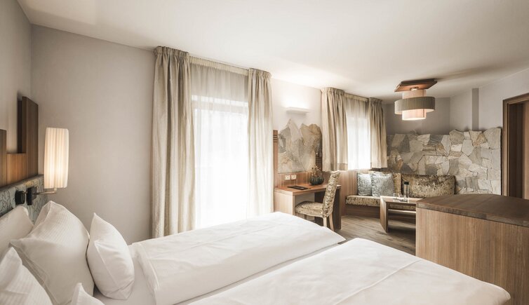 The wellness areas extend over 2,500 m² and include the Dolomites Sky Spa with a breathtaking panoramic infinity pool and various relaxation areas exclusively for adults, a separate wellness area for families with pools and dress-on saunas, and the "Castello di Dolasilla" for relaxing treatments.