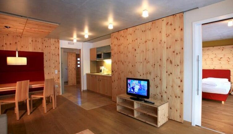 The highlight of this accommodation are the four ‘Grand Apartments’ with up to approx. 70 m² of living space and an occupancy of up to 6 people. The pine wood furnishings and the large panoramic windows ensure a cosy atmosphere and heavenly relaxation.